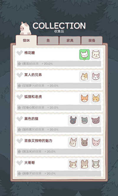 集齐猫咪品种,工作效果会提升20%。天赋有加成效果,技能可以价钱。