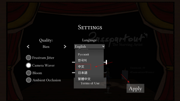 游戏里的每一种场景及画画方式,都由玩家亲自操作,可通过NPC来购买一些画纸画笔等等。 玩家可在游戏中更改英文标识,改为中文版本,更改方式为主,界面左边框倒数第2个,点击,可直接下拉框架,选择中文后再去使用。