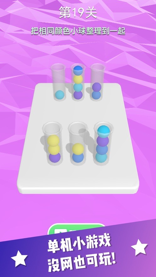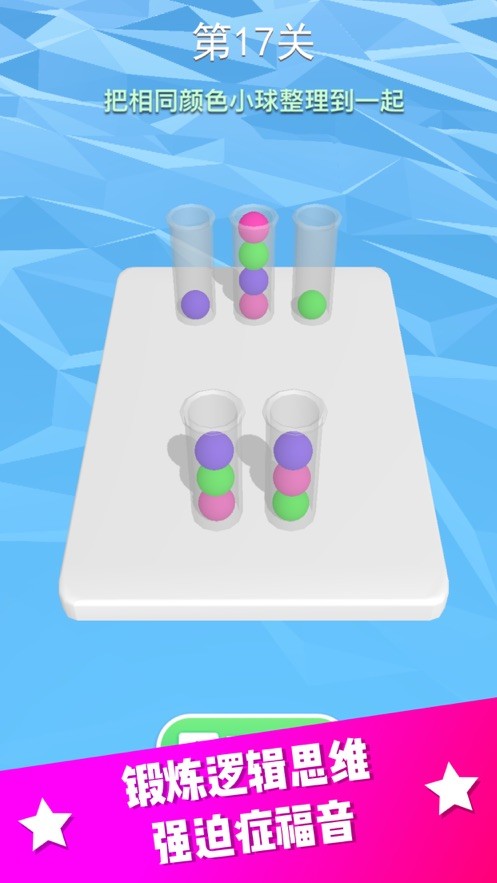 《整理球球》是一款极具趣味性的竞技冒险休闲益智小游戏。在这里,玩家会遇到各种五彩缤纷的小球和不同形状的小瓶子。这些瓶子里装着混杂的各种颜色,给具有强迫倾向的玩家提供了更多挑战自我的机会。你可以通过点击屏幕来移动球体,将相同颜色的球放入同一瓶子中,根据个人游戏规则完成各种任务。这款游戏随时随地都能为你提供娱乐,帮助你放松心情。感兴趣的话,不妨一起来体验吧。