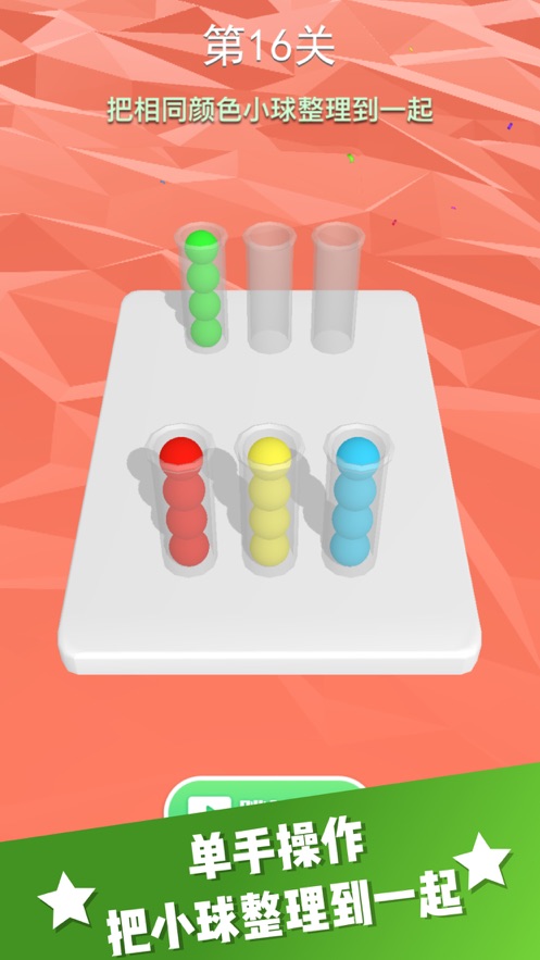 《整理球球》是一款非常有趣的休闲益智游戏,玩家可以在这里体验到独特的玩法。只需轻轻动动手指,完成各种挑战任务,把不同颜色的球球分别整理进相应的瓶子中,避免颜色混淆。这是一个极其简单的任务,玩家需要将所有相同颜色的球球放入对应的瓶子中。
