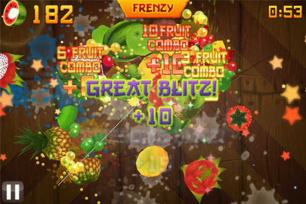 禅境模式:禅境模式中,只会不断出现水果,时间为一分半。在这一分半内谁因连击而切出的分数越高,谁就是胜利者。游戏不会因水果的掉落而失败。