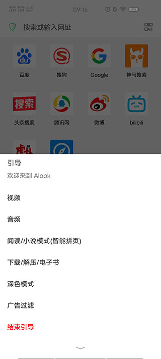 下载并打开alook浏览器安卓版,会出现引导菜单该浏览器是没有广告的,要是没有会员看视频比在APP看还要给力。