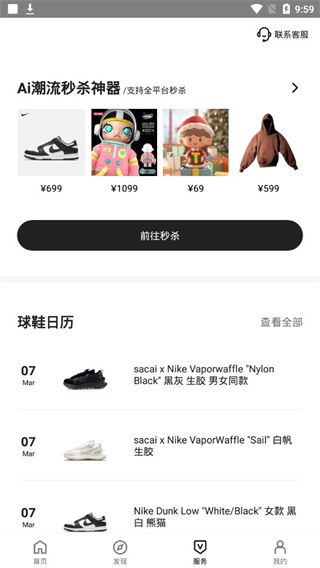 在服务中可以看到时下秒杀的产品,当然大家有什么问题也是可以联系客服的,点击右上角即可;